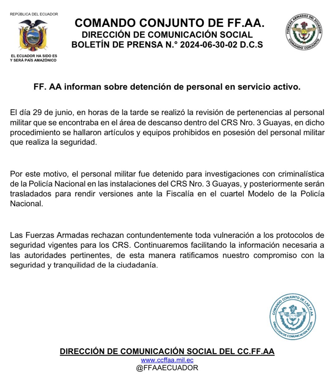 «En dicho procedimiento se encontraron artículos y equipos prohibidos en posesión del personal militar encargado de la seguridad,» señala el comunicado. Los militares fueron detenidos para investigaciones, las cuales serán conducidas por Criminalística de la Policía Nacional antes de ser trasladados para rendir declaraciones en la Fiscalía en el cuartel Modelo de Guayaquil.