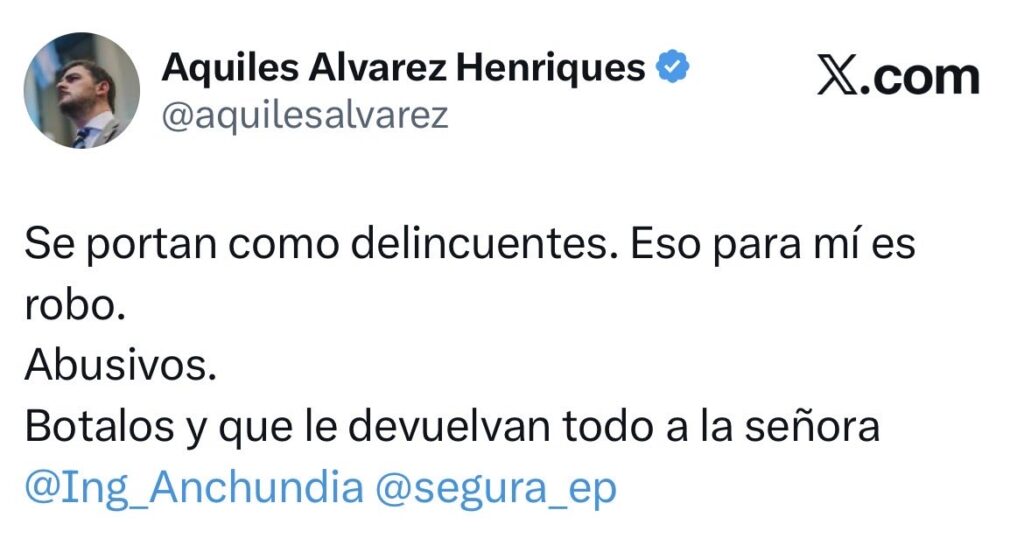 La reacción del alcalde Aquiles Álvarez fue inmediata y contundente. A través de su cuenta en X, calificó el hecho como inaceptable y exigió medidas ejemplares. “Eso para mí es robo. Abusivos”, escribió, dirigiéndose al gerente de Segura EP, Alex Anchundia, y pidiendo la separación de los agentes y la devolución total de la mercadería a la ciudadana afectada.