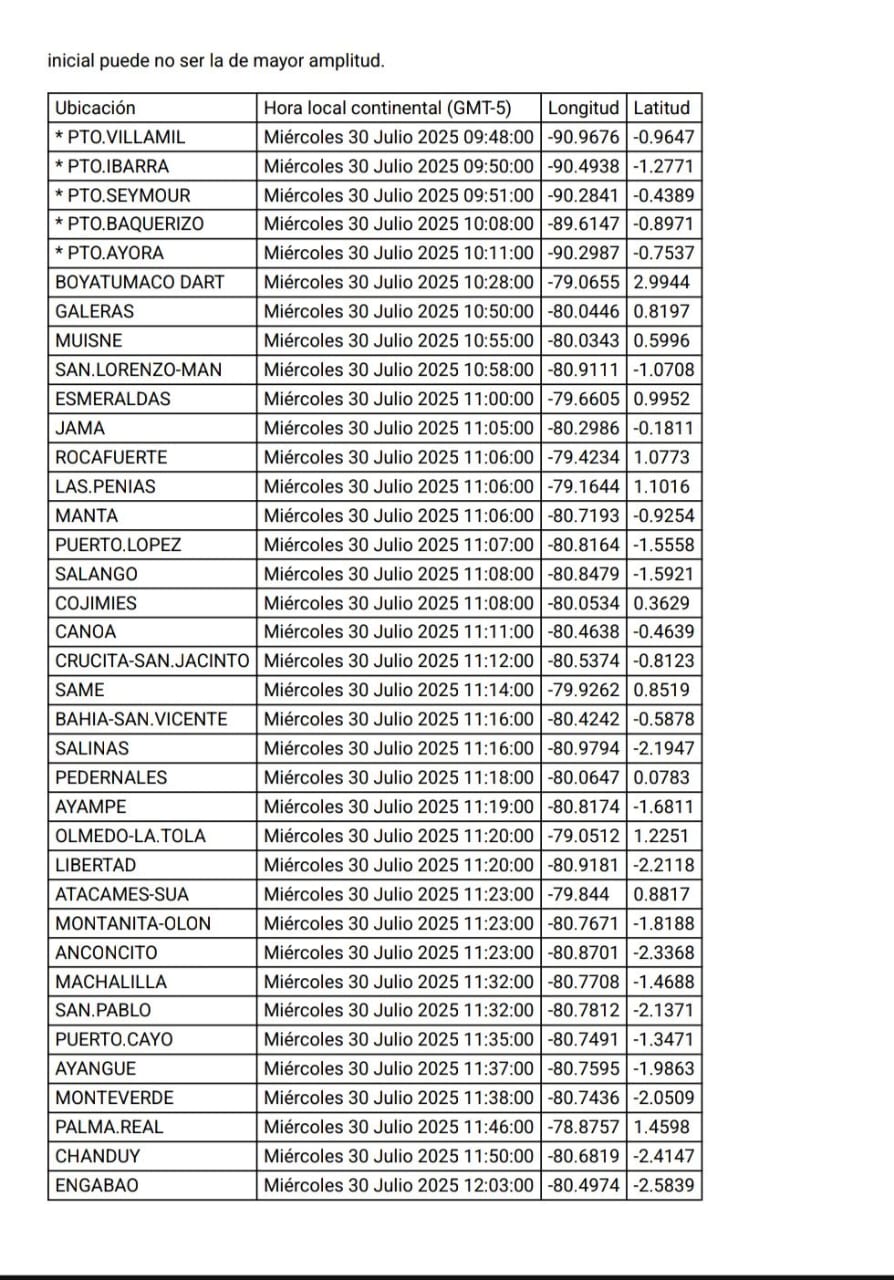 El boletín de alerta emitido por Inocar a las 20:47 incluye las horas estimadas en que podrían llegar las primeras olas. Se prevé que el sector más expuesto sea Puerto Seymour (Galápagos), a las 09:48 (hora continental).