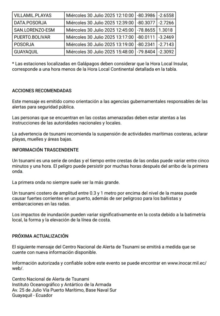 En el caso de Ecuador, el Instituto Oceanográfico de la Armada (Inocar) activó un estado de Advertencia para Galápagos y mantiene Observación para la región continental, tras confirmar una alta probabilidad de afectación.