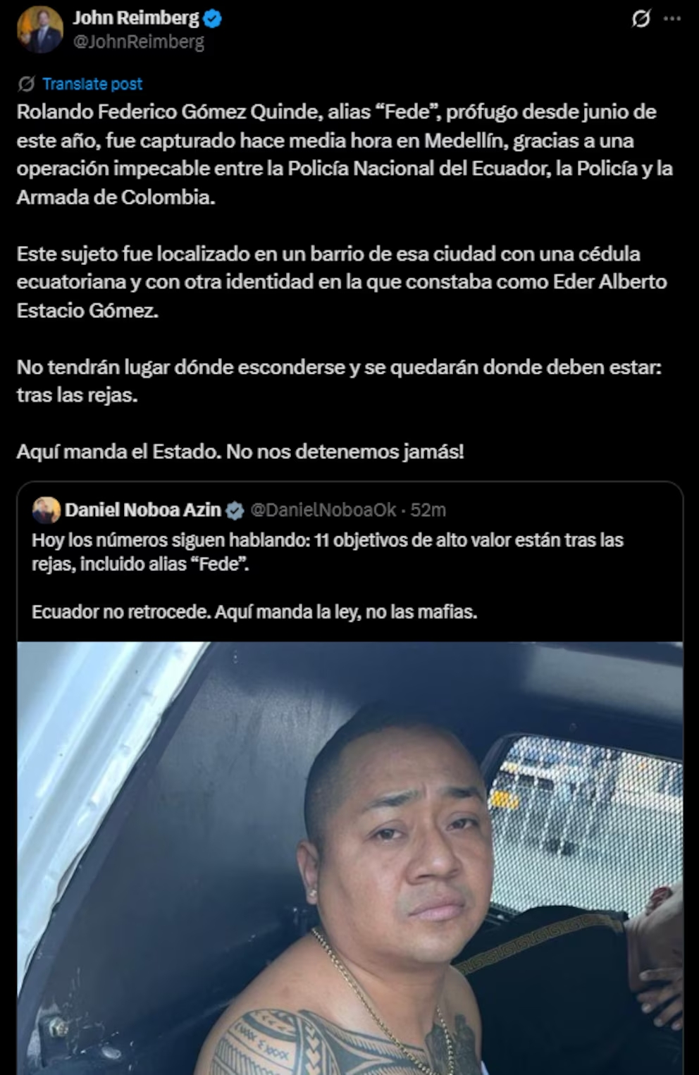Alias Fede había escapado del CPL N°1 de Guayaquil en junio de 2025, en un hecho que Noboa calificó como “traición” y no un simple descuido. El mandatario ordenó investigar y detener al personal penitenciario que habría facilitado su fuga, según reportó CNN Latinoamérica.