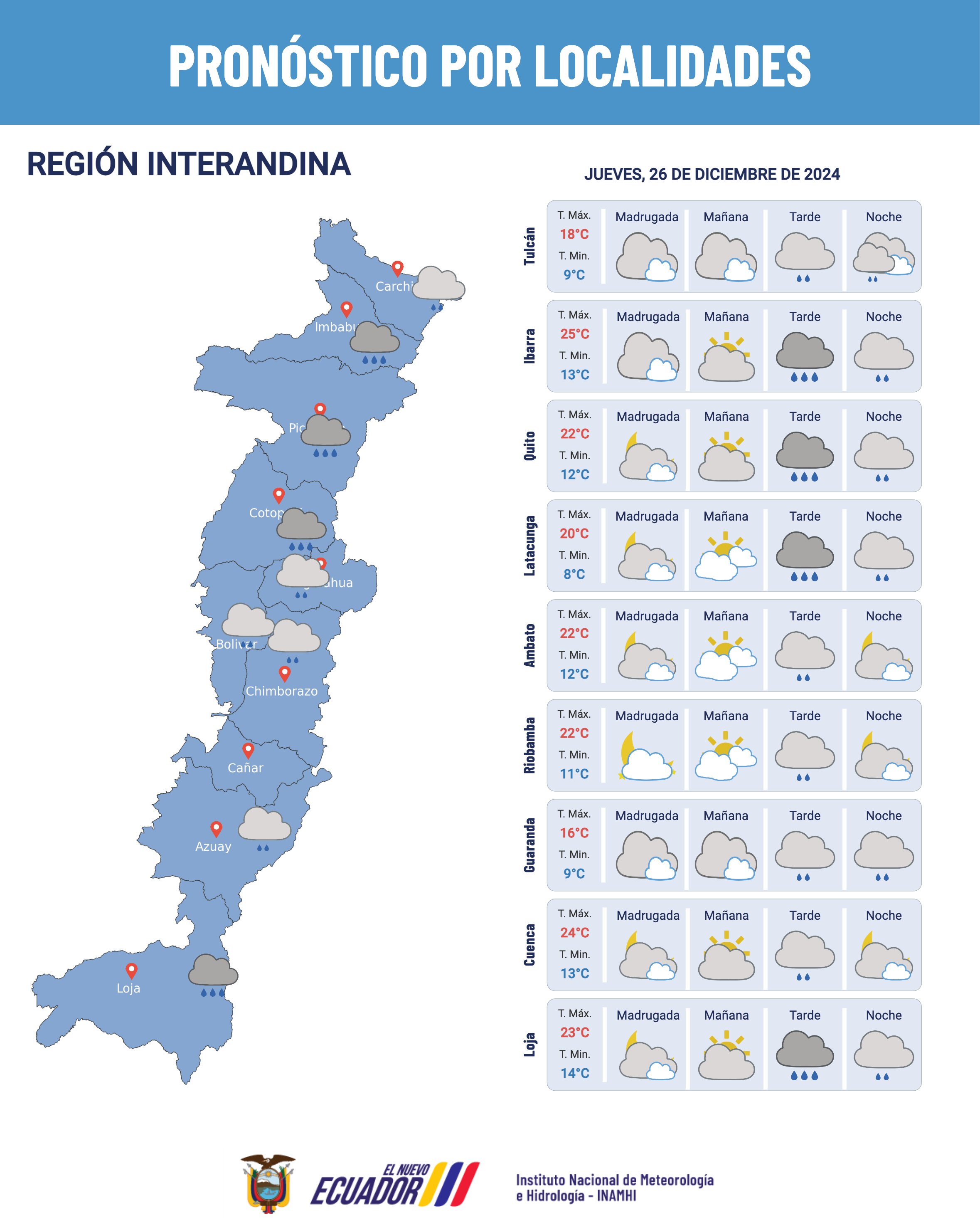 El Instituto de Meteorología e Hidrología (Inamhi) ha anunciado lluvias de variable intensidad para las provincias de la Sierra este jueves, 26 de diciembre. Estas precipitaciones se concentrarán principalmente en horas de la tarde y noche.