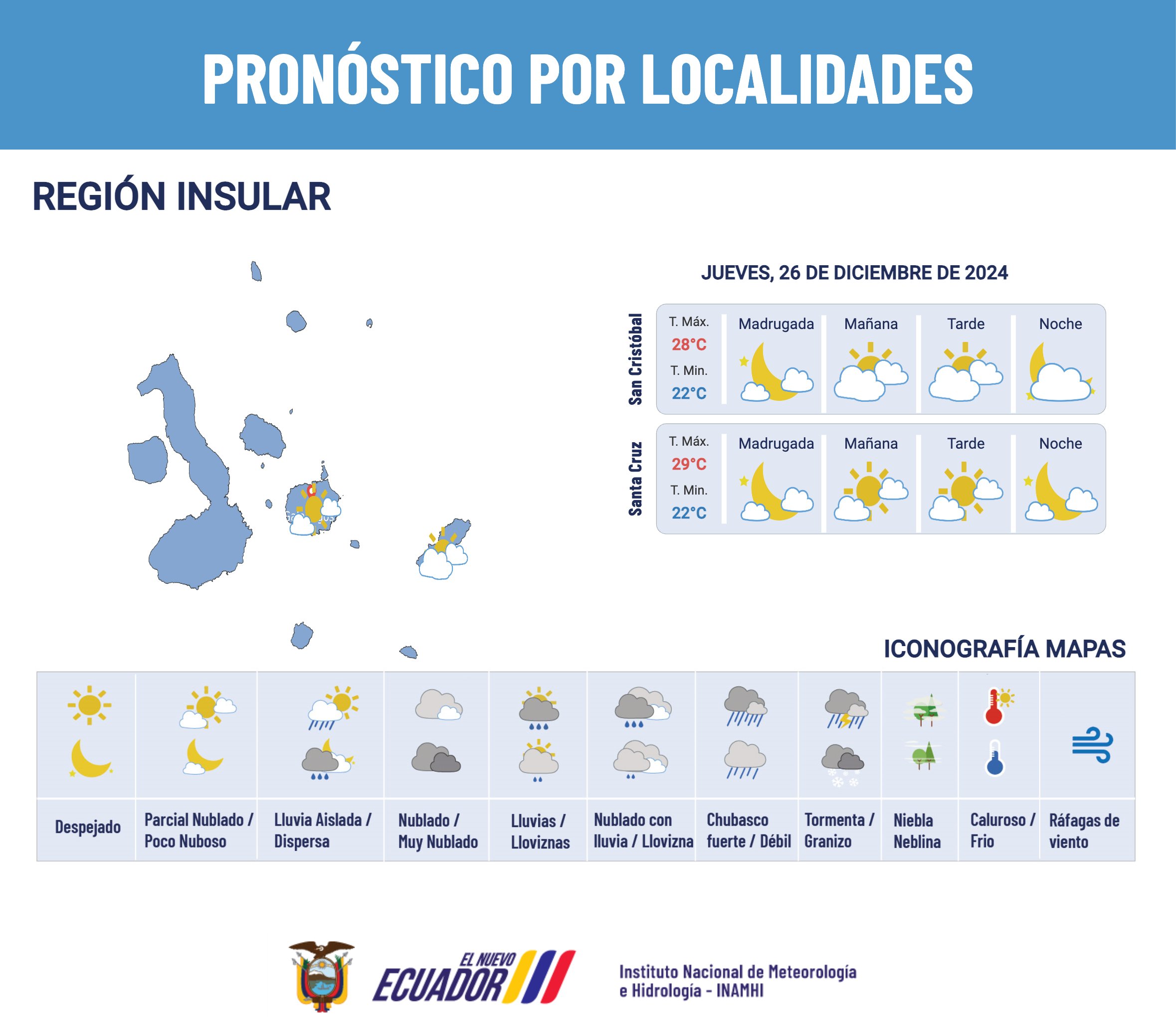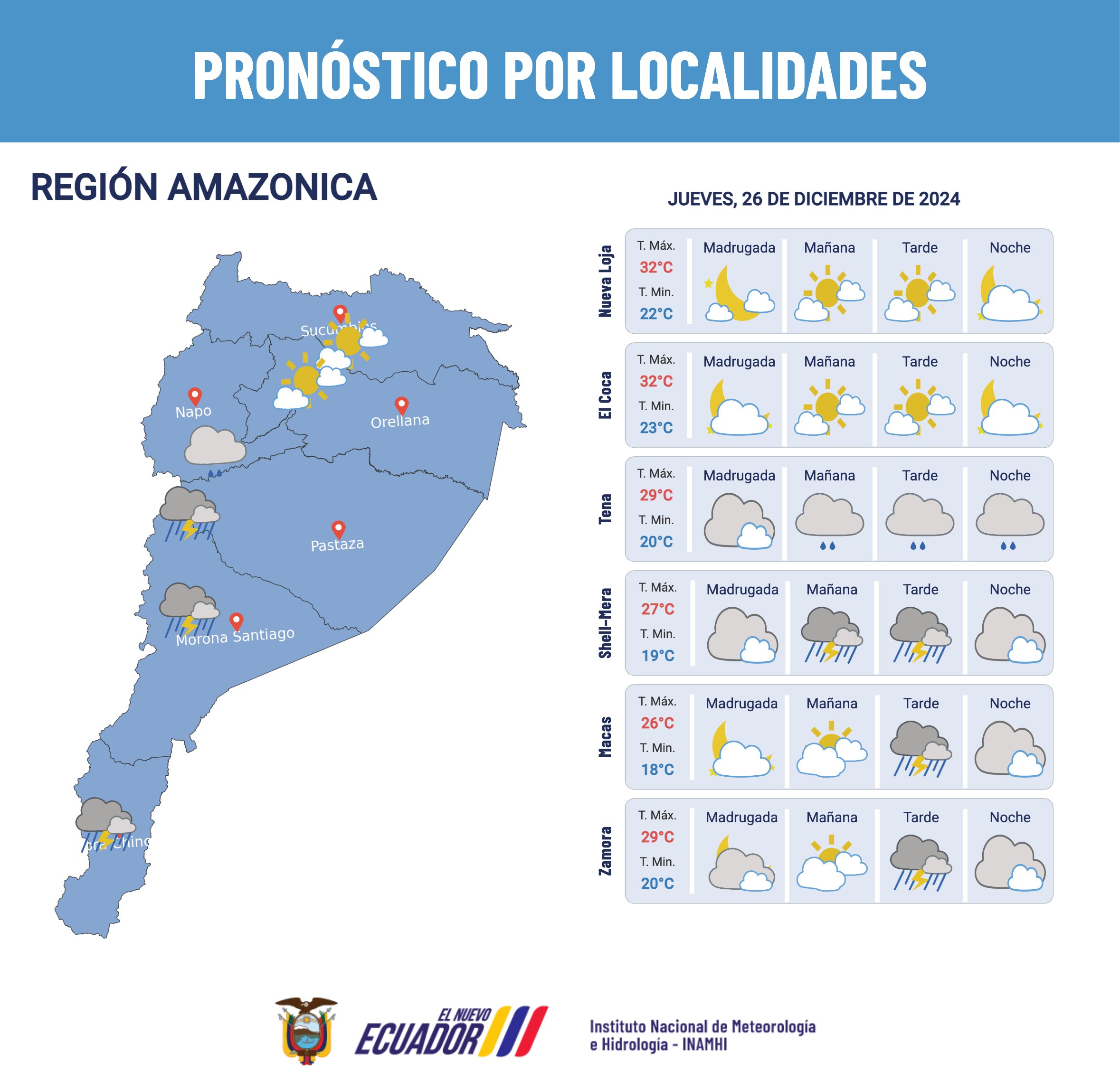 El Inamhi ha destacado que los días 25 y 26 de diciembre serán los más lluviosos de la semana en la Sierra y la Amazonía. Las provincias de Carchi, Imbabura, Pichincha y Loja tendrán las precipitaciones más significativas, con acumulaciones de entre 12 y 27 milímetros por día.