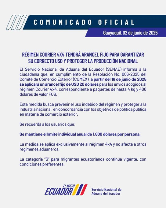 Desde el 16 de junio, todas las importaciones bajo el régimen 4×4 (categoría B) pagarán una tasa fija de $20. Este sistema permite traer productos personales de hasta 4 kilos y $400 FOB, sin aranceles ni IVA, y fue creado en 2012 especialmente para migrantes.