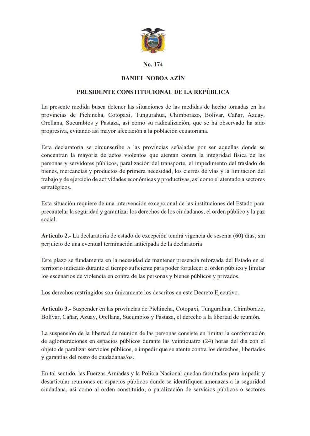 El texto presidencial argumenta que “persisten los hechos violentos en dichas zonas y, para evitar que alcancen niveles incontrolables, es indispensable mantener el mismo régimen”.