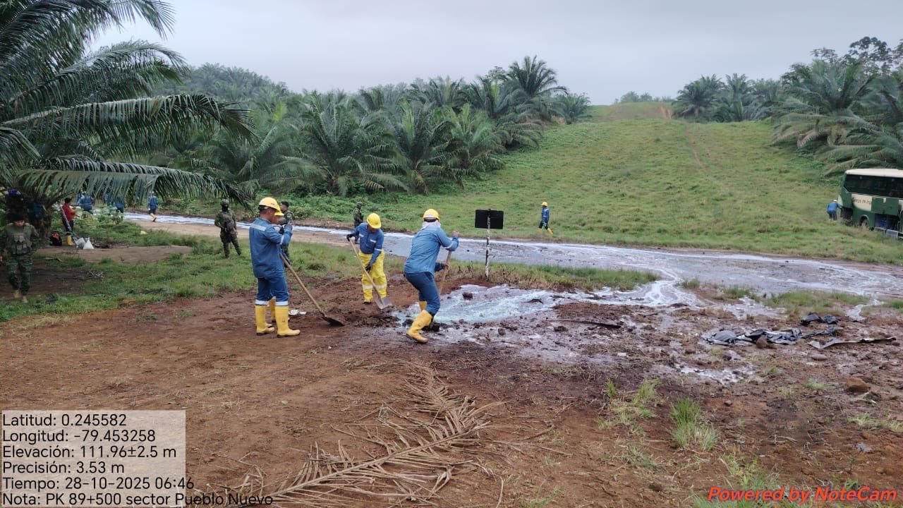 El Cuerpo de Bomberos de Quinindé y técnicos de Petroecuador se trasladaron hasta el sitio para contener la fuga y evitar la expansión del combustible hacia zonas más amplias. En el lugar trabajan más de 20 operarios de la empresa pública, que realizan tareas de remediación y limpieza del terreno afectado.