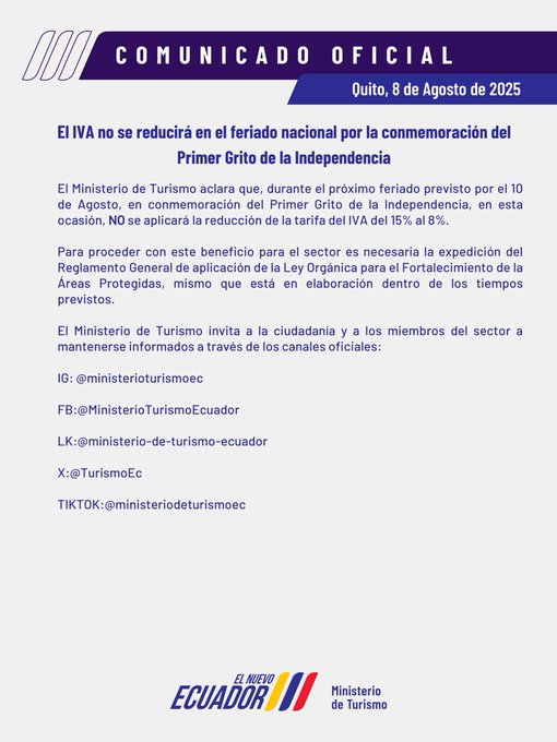 Durante el feriado nacional por el Primer Grito de la Independencia, que se conmemora el 10 de agosto y se traslada al lunes 11, no habrá reducción del IVA del 15 % al 8 % en los servicios turísticos.