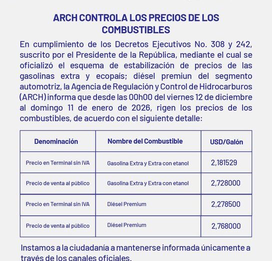 La cifra representa un descenso de 0,032 centavos, una variación que llega justo después de que el presidente Daniel Noboa firmara el Decreto N.º 242, el documento que cambia la fórmula oficial para calcular los precios de los combustibles en el país.