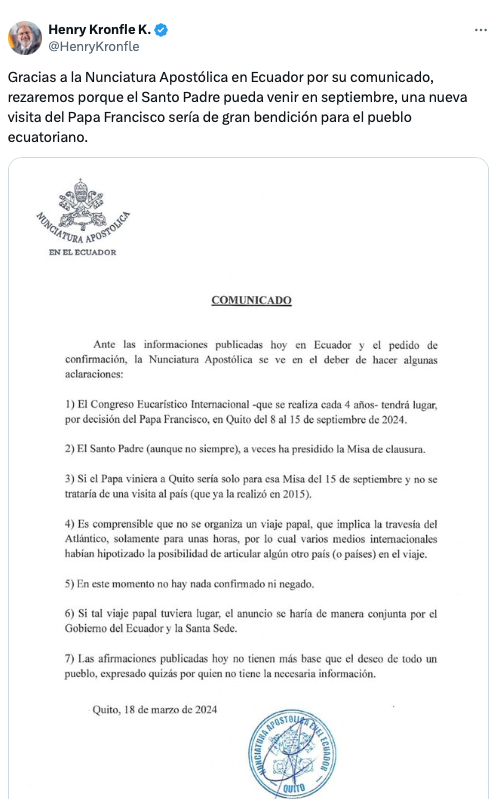 El presidente de la Asamblea Nacional, Henry Kronfle, mencionó que el Papa Francisco llegaría a Ecuador en septiembre, pero el representante del Papa en Ecuador, el Nuncio Apostólico Andrés Carrascosa, desmintió esta información.