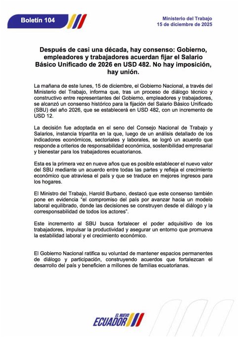 El Consejo Nacional de Trabajo y Salarios definió este 15 de diciembre de 2025 el nuevo salario básico unificado para 2026, que se fijó en USD 482, luego de alcanzar un consenso entre representantes de empleadores y trabajadores. El ajuste implica un incremento de USD 12 frente al salario vigente de USD 470.