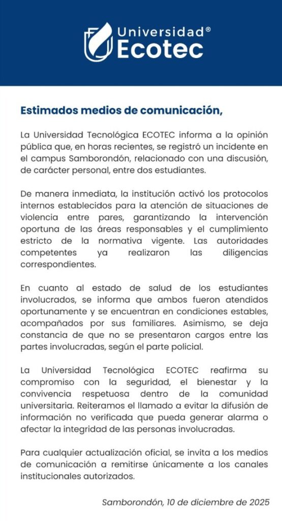 Por su parte, la Universidad Ecotec informó mediante un comunicado que se trató de una discusión entre dos estudiantes y que se activaron los protocolos internos de atención en casos de violencia entre pares. La institución señaló que ambos jóvenes fueron atendidos de forma inmediata y se encuentran en condición estable. Asimismo, reiteró que no hubo denuncias ni acciones legales entre las personas involucradas.