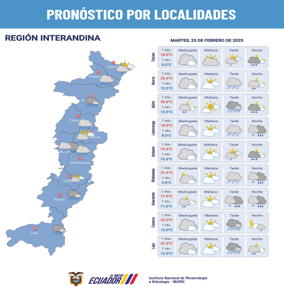 En la Sierra, se esperan lluvias de variable intensidad, con mayor fuerza en Pichincha, Azuay y Loja, donde los aguaceros serán más intensos en horario nocturno. En el resto de las provincias andinas, el cielo permanecerá mayormente nublado.