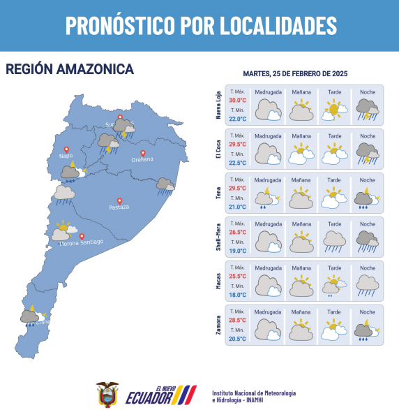 Para la Amazonía, el pronóstico es similar. Sucumbíos y Orellana enfrentarán fuertes lluvias acompañadas de tormentas eléctricas, mientras que en el resto de la región también se presentarán precipitaciones y cielos cubiertos.