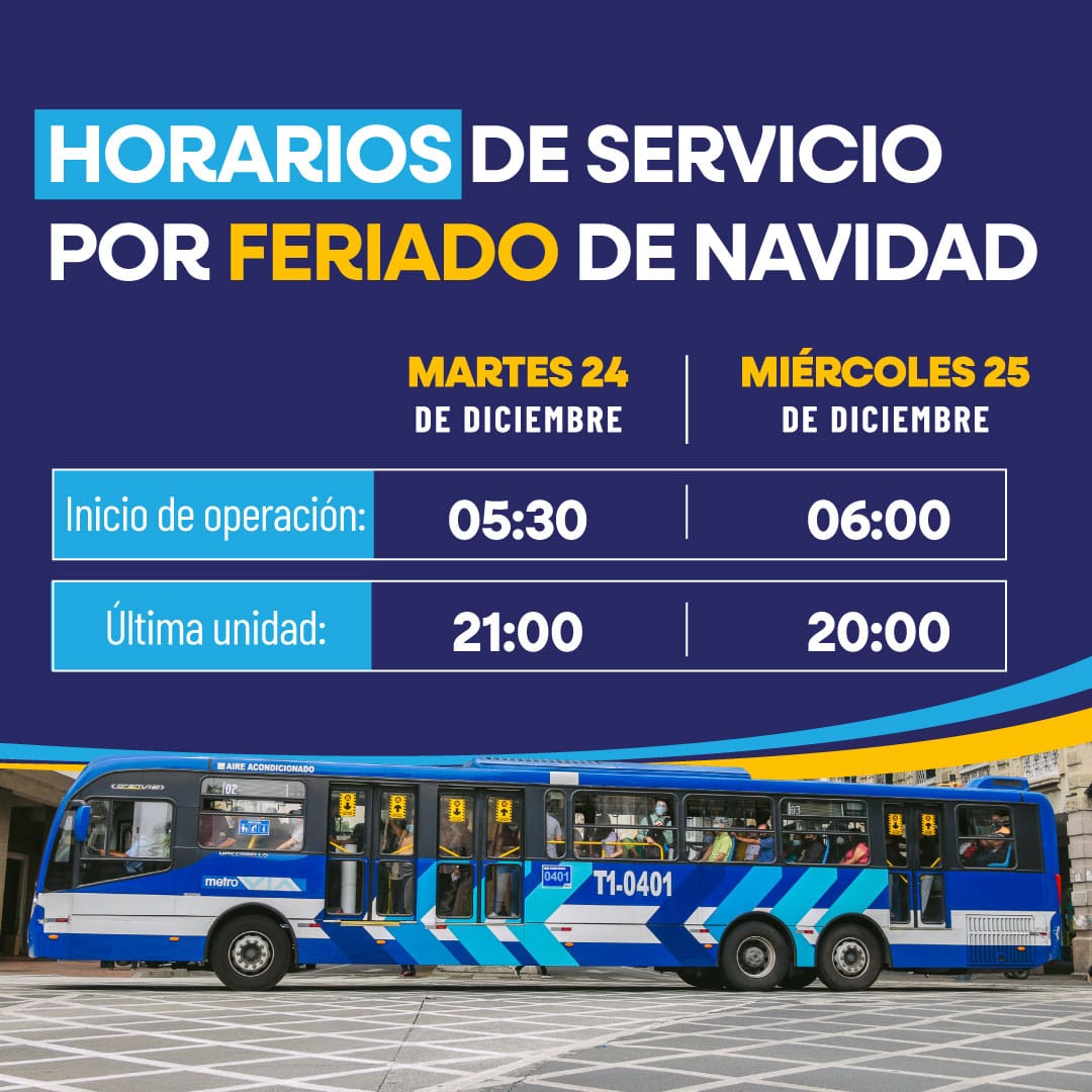 Por motivo de las festividades navideñas, el servicio de Metrovía tendrá horarios especiales. Este martes 24 de diciembre, la última unidad circulará hasta las 21:00, mientras que el miércoles 25 de diciembre, el servicio se prestará desde las 06:00 hasta las 20:00.