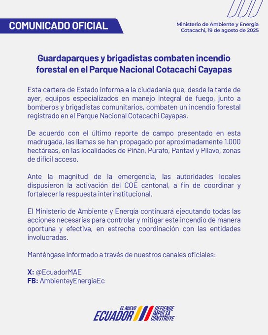 El Parque Nacional Cotacachi Cayapas enfrenta una de sus emergencias ambientales más graves. La mañana de este 18 de agosto de 2025, en coincidencia con el Día de la Prevención de Incendios Forestales, un fuego de gran magnitud se desató en los páramos de Piñán, arrasando con rapidez por la fuerza del viento.
