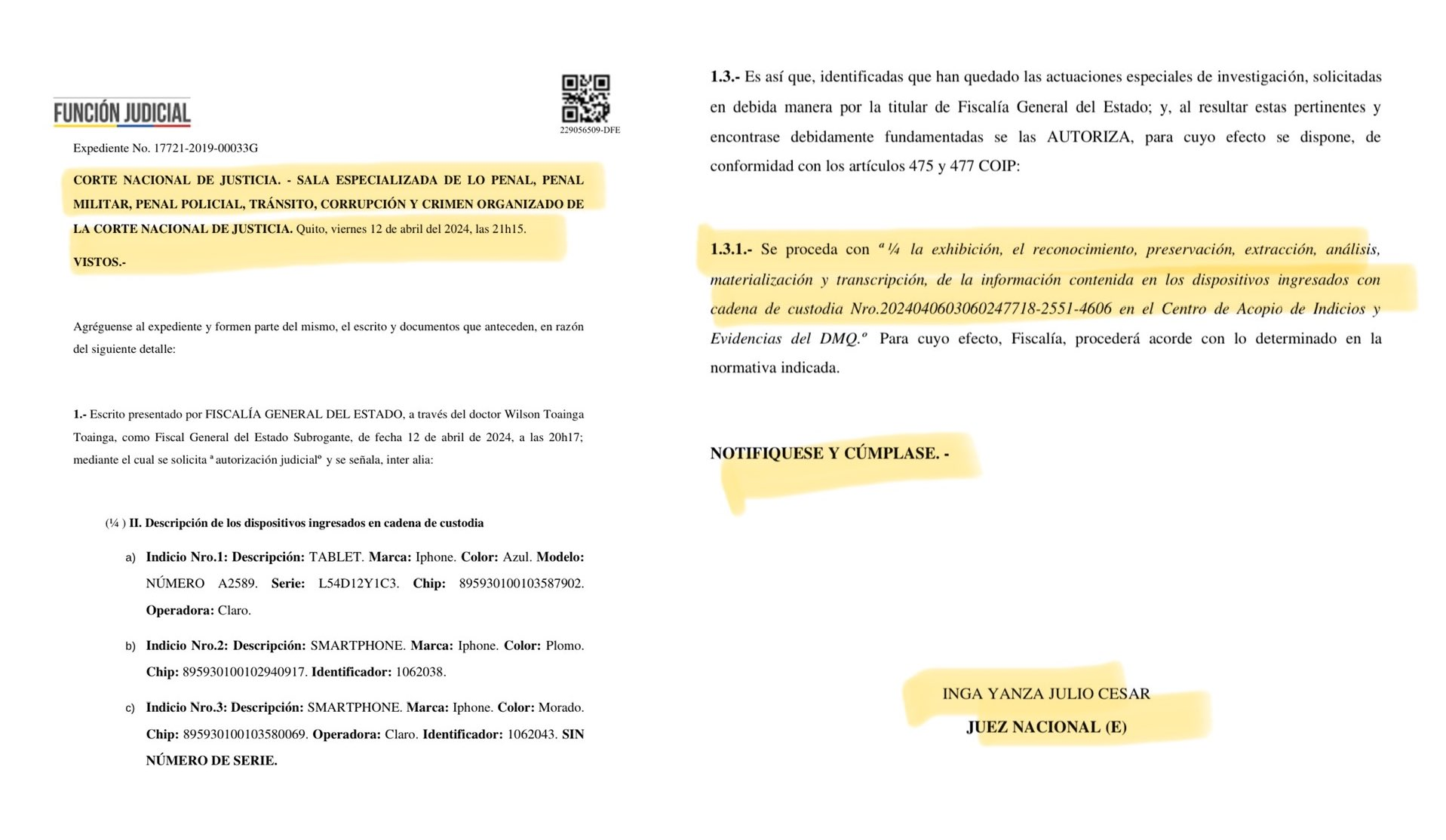 Esta medida se enmarca en la investigación del caso Reconstrucción de Manabí, donde se indaga un posible delito de peculado. La autorización implica la extracción, análisis, materialización y transcripción de la información almacenada en una tablet y dos teléfonos inteligentes incautados durante su arresto.
