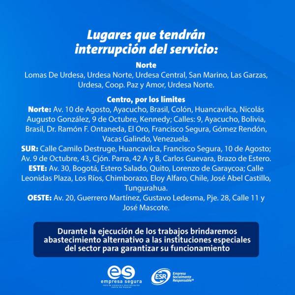 En el sur, zonas como Camilo Destruge y Huancavilca estarán sin agua, mientras que en el este serán afectadas zonas como Estero Salado y avenida Quito. En el oeste, los barrios Guerrero Martínez y Gustavo Ledesma también se quedarán sin agua durante el período establecido.