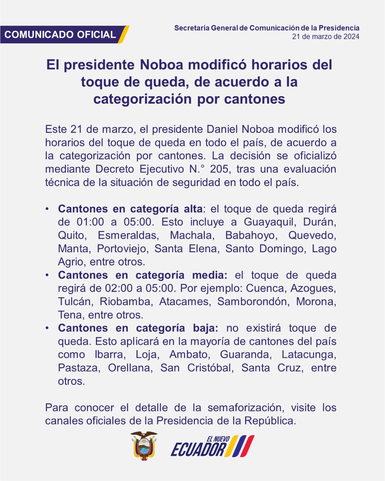 Después de una evaluación técnica de la seguridad en Ecuador, el Gobierno anunció la modificación de los horarios de toque de queda en el país, como parte del estado de excepción vigente desde enero y renovado en marzo de 2024. La nueva regulación se detalla en el decreto ejecutivo Nº 205, emitido el 21 de marzo de 2024, y se ajusta según la clasificación de cada cantón. El principal cambio anunciado es la reducción del horario en los cantones de alto riesgo, como Guayaquil y Quito.