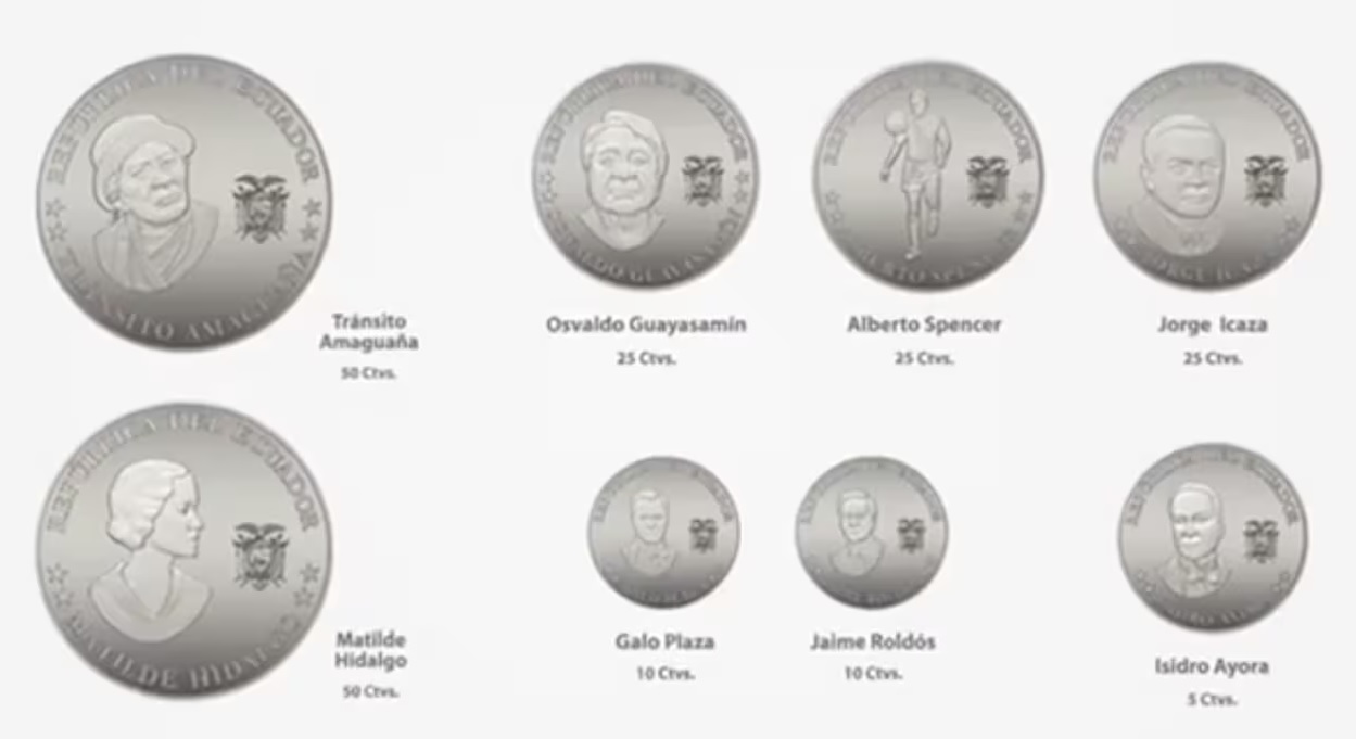 Personajes históricos ecuatorianos como Matilde Hidalgo de Procel, Jaime Roldós y Alberto Spencer, entre otros, han sido incluidos en las nuevas monedas fraccionarias que ya están en circulación en el país, según información proporcionada por el Banco Central. A partir de marzo de 2024, la entidad ha intensificado la promoción de los nuevos rostros que aparecen en monedas con valores de 50, 25, 10 y 5 centavos de dólar a través de spots y campañas en redes sociales.