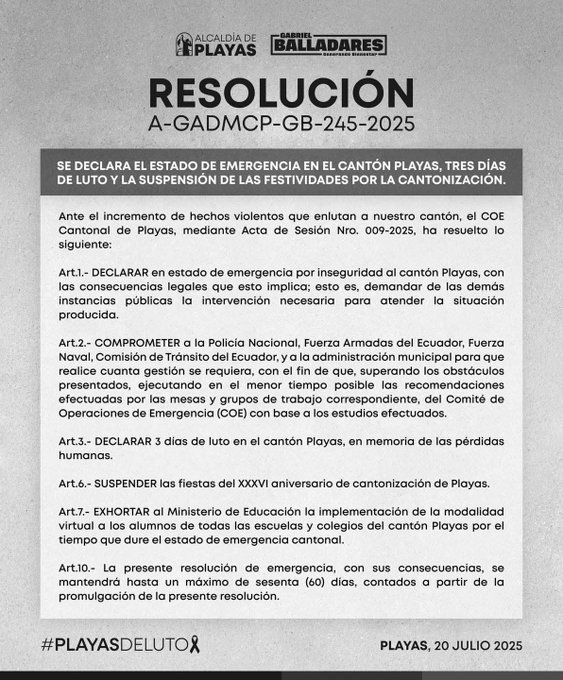 Tras la brutal masacre que cobró la vida de nueve personas, incluido tres funcionarios municipales, el cantón General Villamil Playas entró en un estado de emergencia por dos meses. Así lo resolvió el Comité de Operaciones de Emergencia (COE), que además decretó tres días de luto oficial y canceló las fiestas de cantonización previstas para agosto.