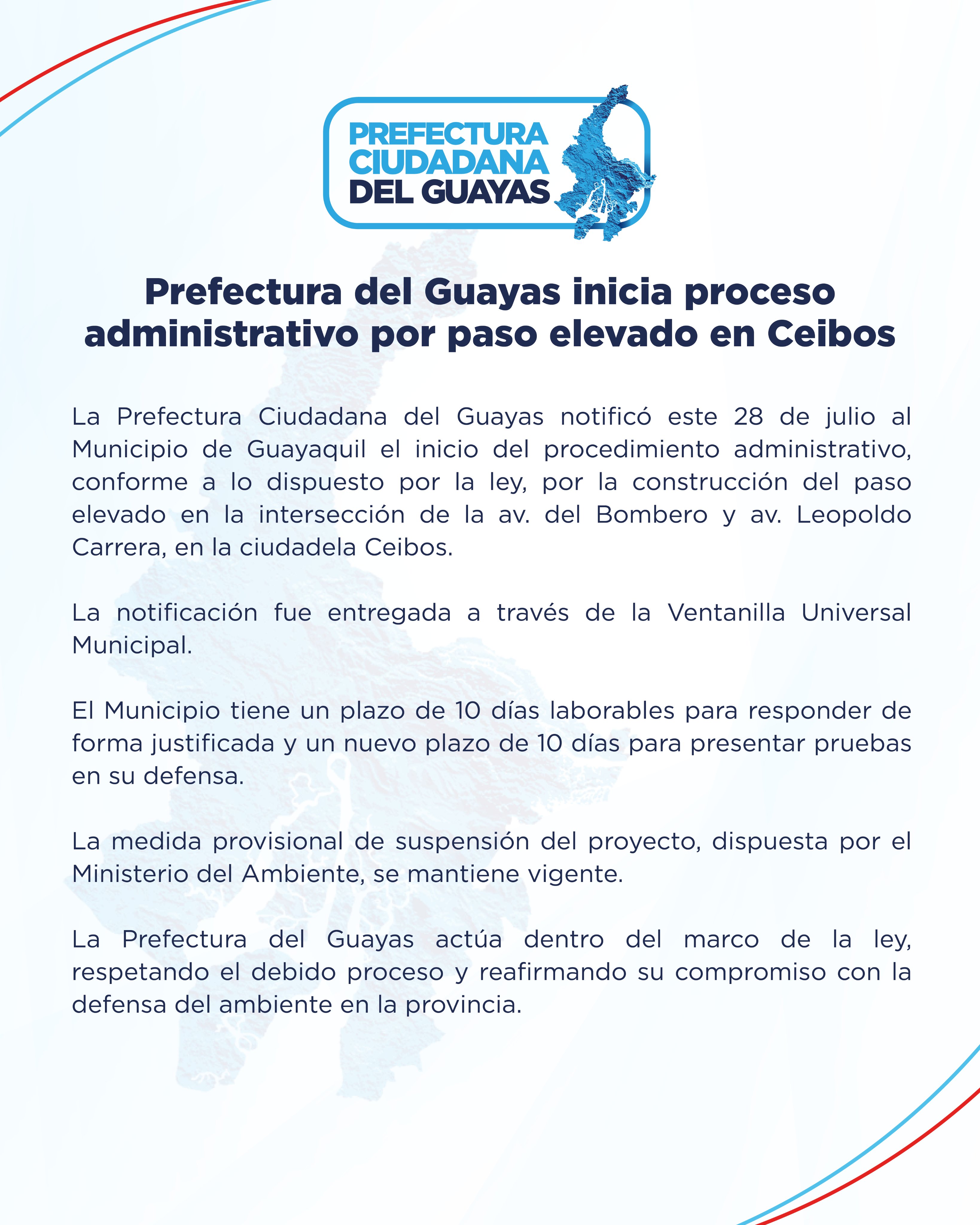 La Prefectura del Guayas notificó al Municipio de Guayaquil el inicio de un proceso administrativo sancionador por la construcción del paso elevado vehicular ubicado en la avenida del Bombero, sector Los Ceibos, al norte de la ciudad.
