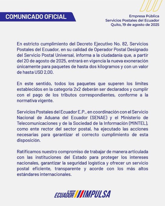 La medida fue anunciada por la Empresa Pública de Servicios Postales del Ecuador, en coordinación con el Servicio Nacional de Aduanas (Senae) y el Ministerio de Telecomunicaciones y Sociedad de la Información (Mintel), con el objetivo de fortalecer la seguridad logística, fomentar la transparencia y facilitar los envíos de bajo costo.