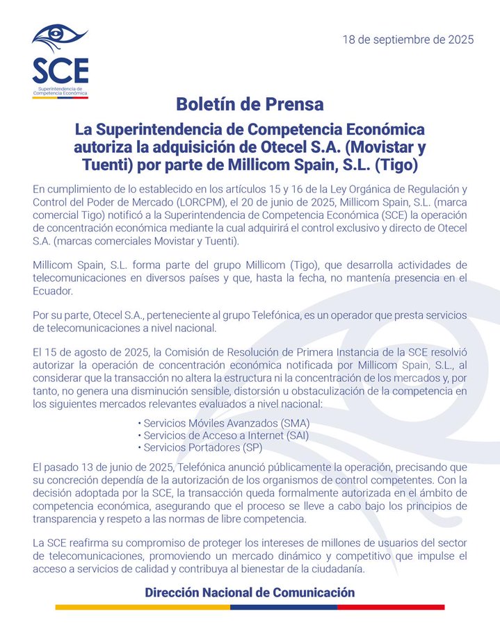 La Superintendencia de Competencia Económica (SCE) dio luz verde a la adquisición de Otecel S. A., empresa que opera en Ecuador con las marcas Movistar y Tuenti, por parte de Millicom Spain S. L., matriz de la marca internacional Tigo.