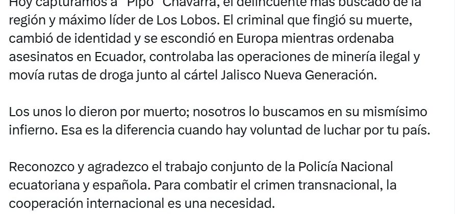 Noboa aprovechó el anuncio para remarcar la efectividad de la cooperación policial entre Ecuador y España. “Unos lo dieron por muerto; nosotros lo buscamos en su mismísimo infierno”, escribió. El mensaje reaviva el debate sobre la penetración del crimen organizado en instituciones estatales.