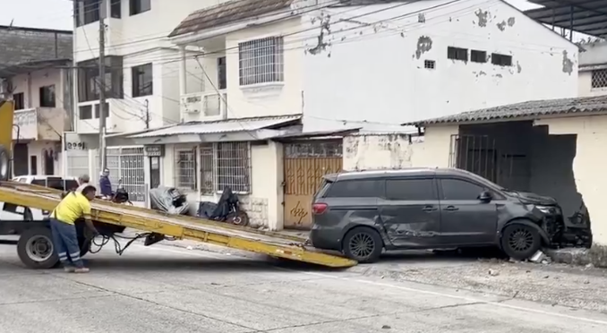 Un violento accidente en Guayacanes dejó destruida una vivienda cuando un vehículo perdió el control tras chocar contra otro automóvil.