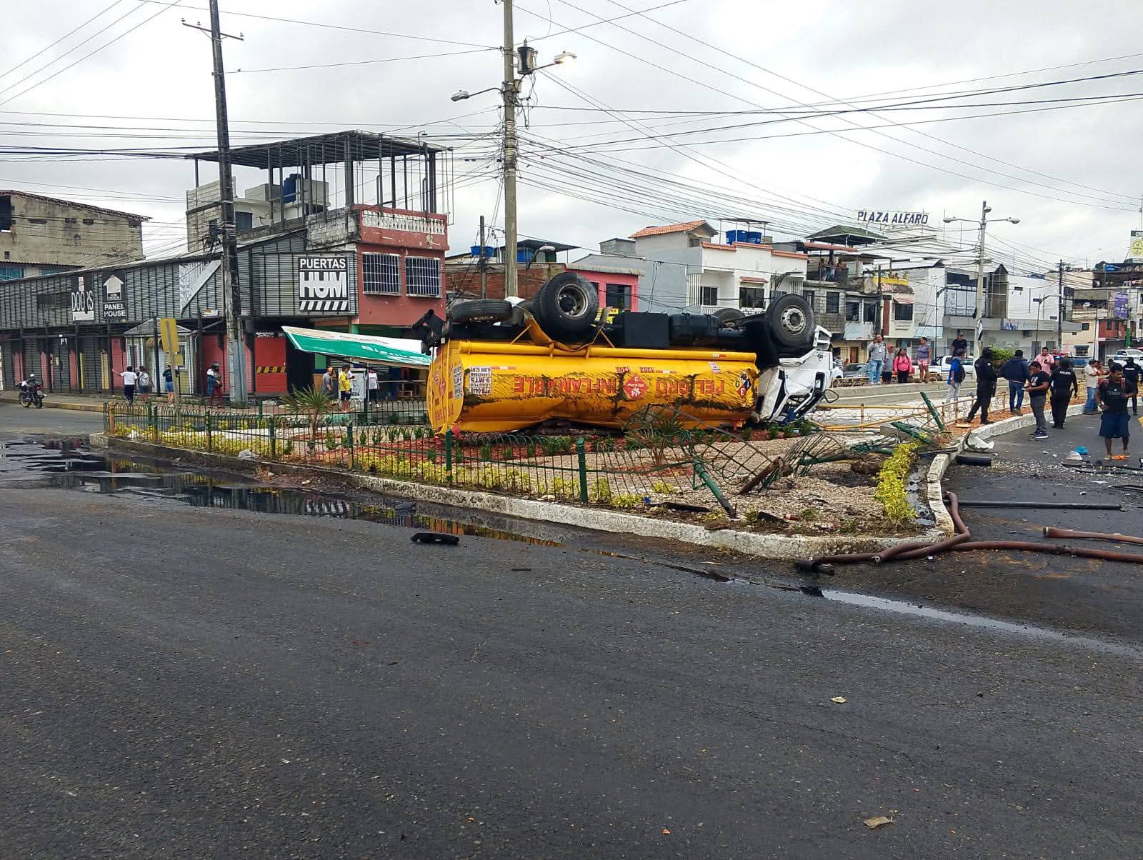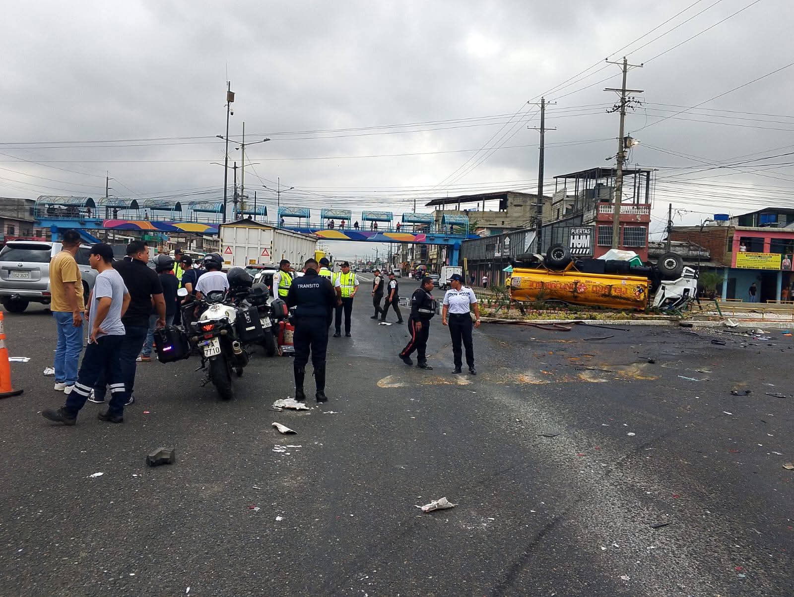 Un tanquero volcado en la Av. Nicolás Lapentti de Durán provocó congestión vehicular y dejó heridos, incluyendo una agente de tránsito. Testigos afirman que el tanquero la impactó. Organismos de socorro atienden la emergencia.