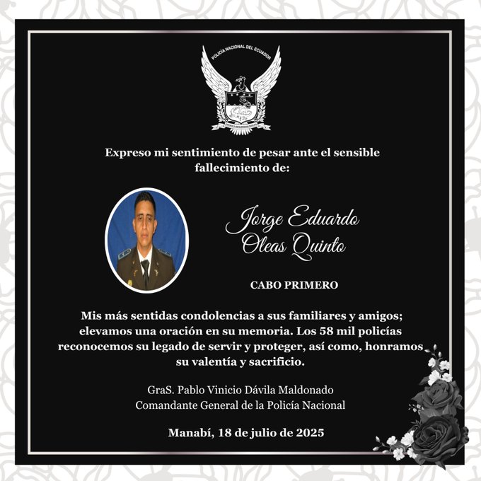 El uniformado Jorge Oleas Quinto fue atacado mientras cenaba en un local de la ciudadela 20 de Mayo. Recibió múltiples disparos por parte de sicarios que huyeron sin dejar rastro. Aunque fue trasladado a un hospital, los médicos confirmaron su muerte poco después.