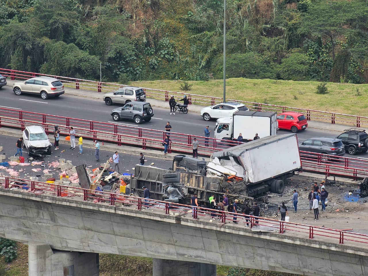 Nueve vehículos, incluyendo dos camiones, un motociclista y seis autos, protagonizan un siniestro múltiple esta mañana en Cumbayá, Quito. El incidente ha dejado un fallecido y seis personas heridas, esparciendo pedazos de parabrisas y chasis por toda la vía.