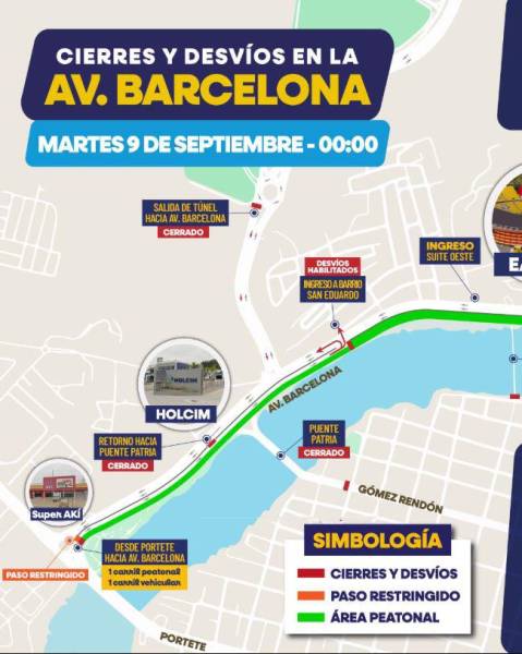 📆 El martes 9 de septiembre, desde la medianoche, la avenida Barcelona quedará exclusivamente peatonal, restringiendo el acceso vehicular hacia la ciudadela Ferroviaria. Además, el puente Patria, ubicado en la avenida Gómez Rendón, también permanecerá cerrado.