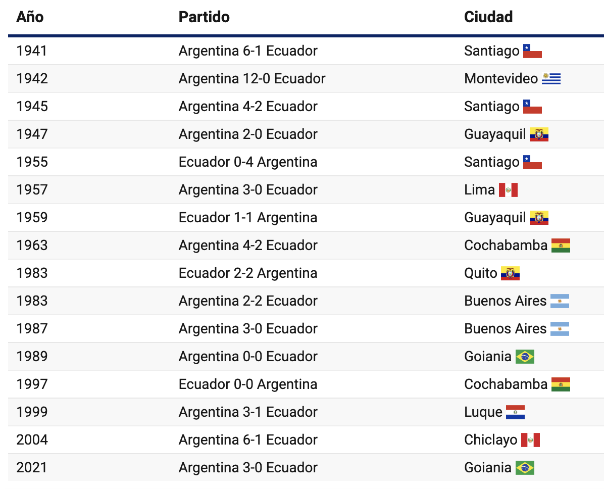 La última vez que Ecuador sumó un punto ante Argentina en Copa América fue el 11 de junio de 1997 en Cochabamba, en un empate 0-0. Desde entonces, todos los encuentros contra este rival han terminado en derrotas abultadas: 3-1 en 1999, 6-1 en 2006 y 3-0 en 2021.