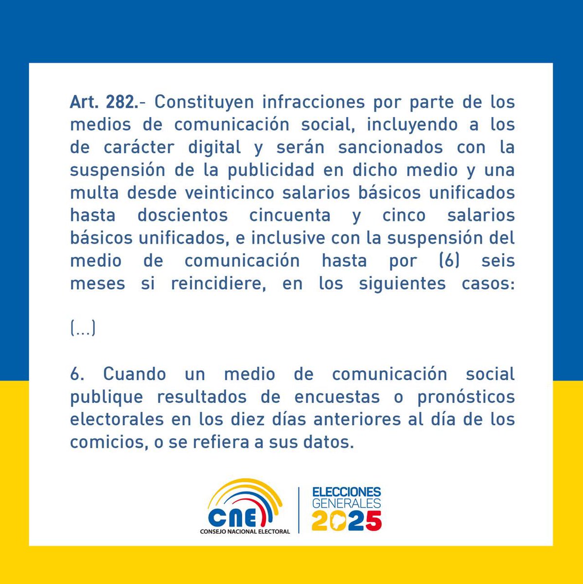 El consejero del CNE, Enrique Pita, recordó que desde el viernes 31 de enero, los medios de comunicación deben suspender la difusión de encuestas y pronósticos electorales en vista de las elecciones de 2025. Esto se debe a lo que establece el Código de la Democracia, que prohíbe la publicación de tales datos diez días antes de los comicios, previstos para el domingo 9 de febrero.