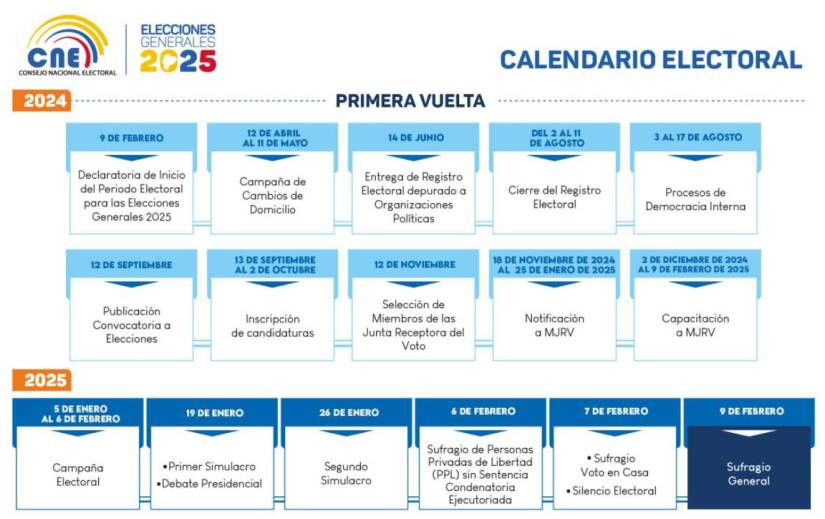 Desde el 25 de noviembre, el Instituto Geográfico Militar (IGM) inició la impresión de papeletas electorales para las dignidades de asambleístas nacionales y parlamentarios andinos. Todo el material deberá estar listo antes del 6 de febrero, fecha en la que comenzará el sufragio de personas privadas de libertad en el marco de las Elecciones Generales de 2025.