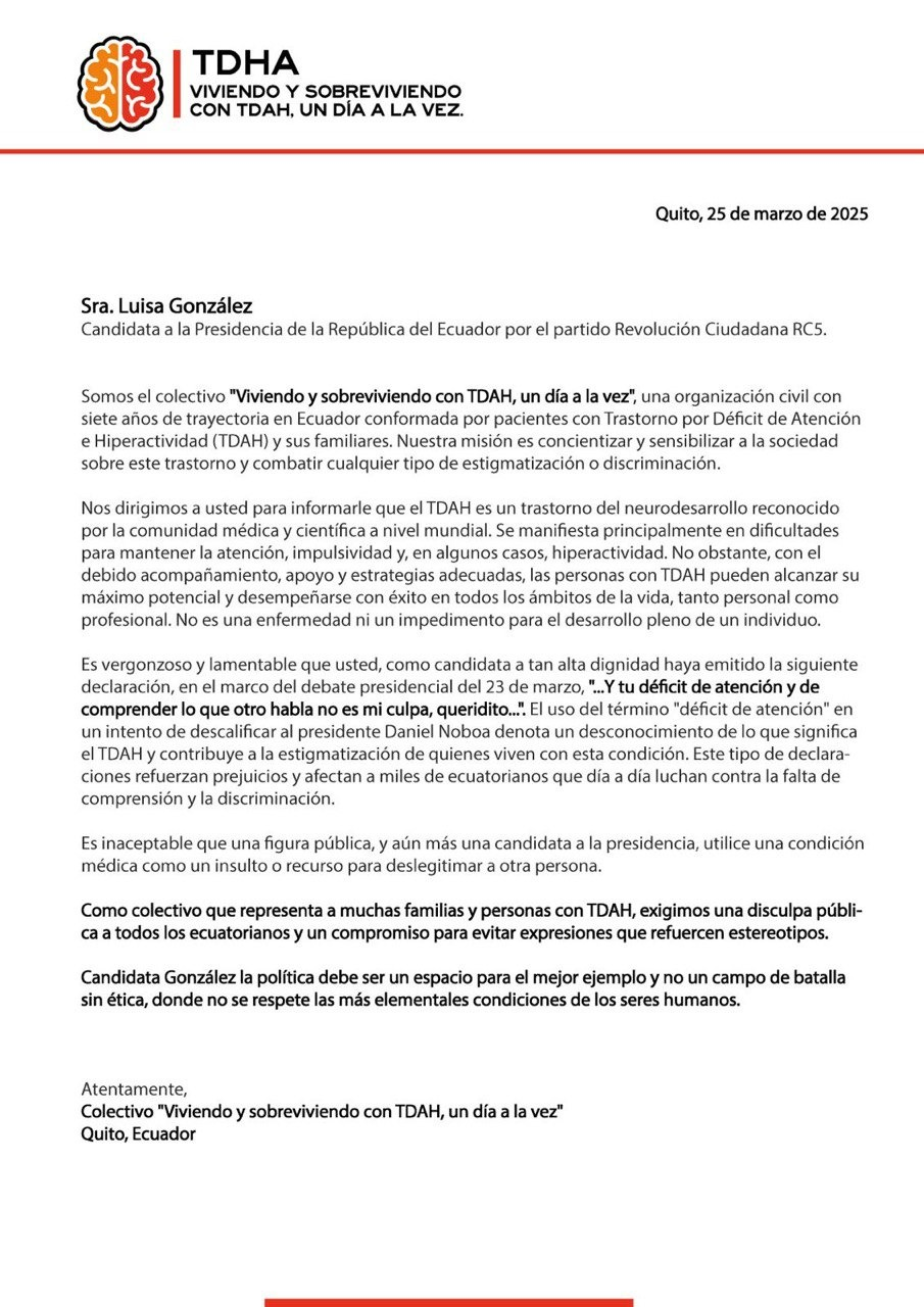 El colectivo «Viviendo y sobreviviendo con TDAH, un día a la vez» emitió un comunicado este martes 25 de marzo, rechazando enérgicamente los comentarios de la candidata presidencial Luisa González durante el Debate Presidencial 2025, en el que utilizó el término «déficit de atención» de manera despectiva para referirse al presidente y candidato Daniel Noboa.