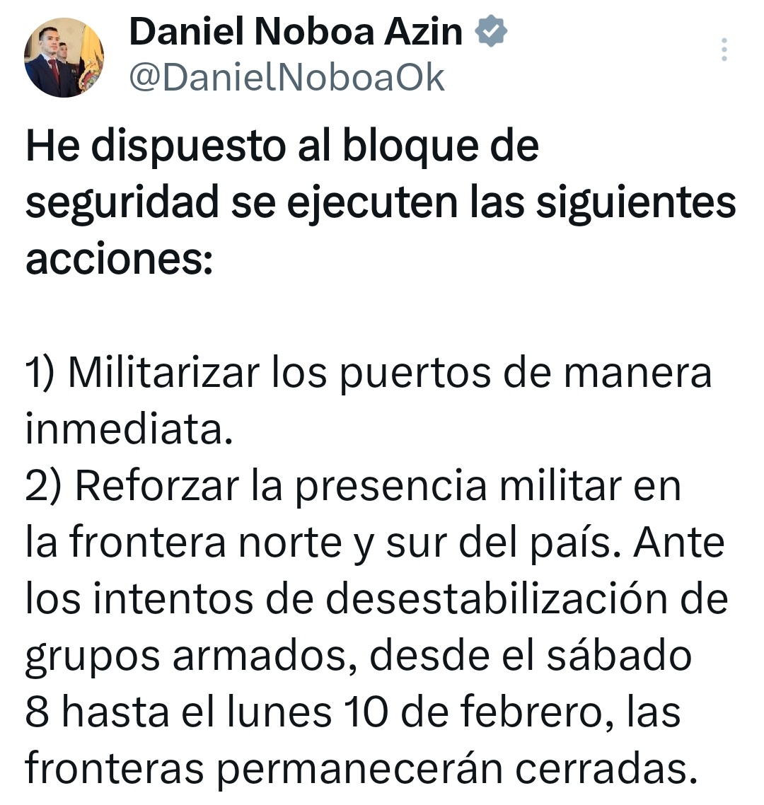 Ecuador 2025: Noboa ordena militarización de puertos y refuerzo de seguridad en fronteras