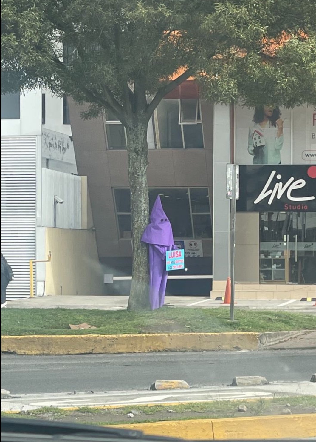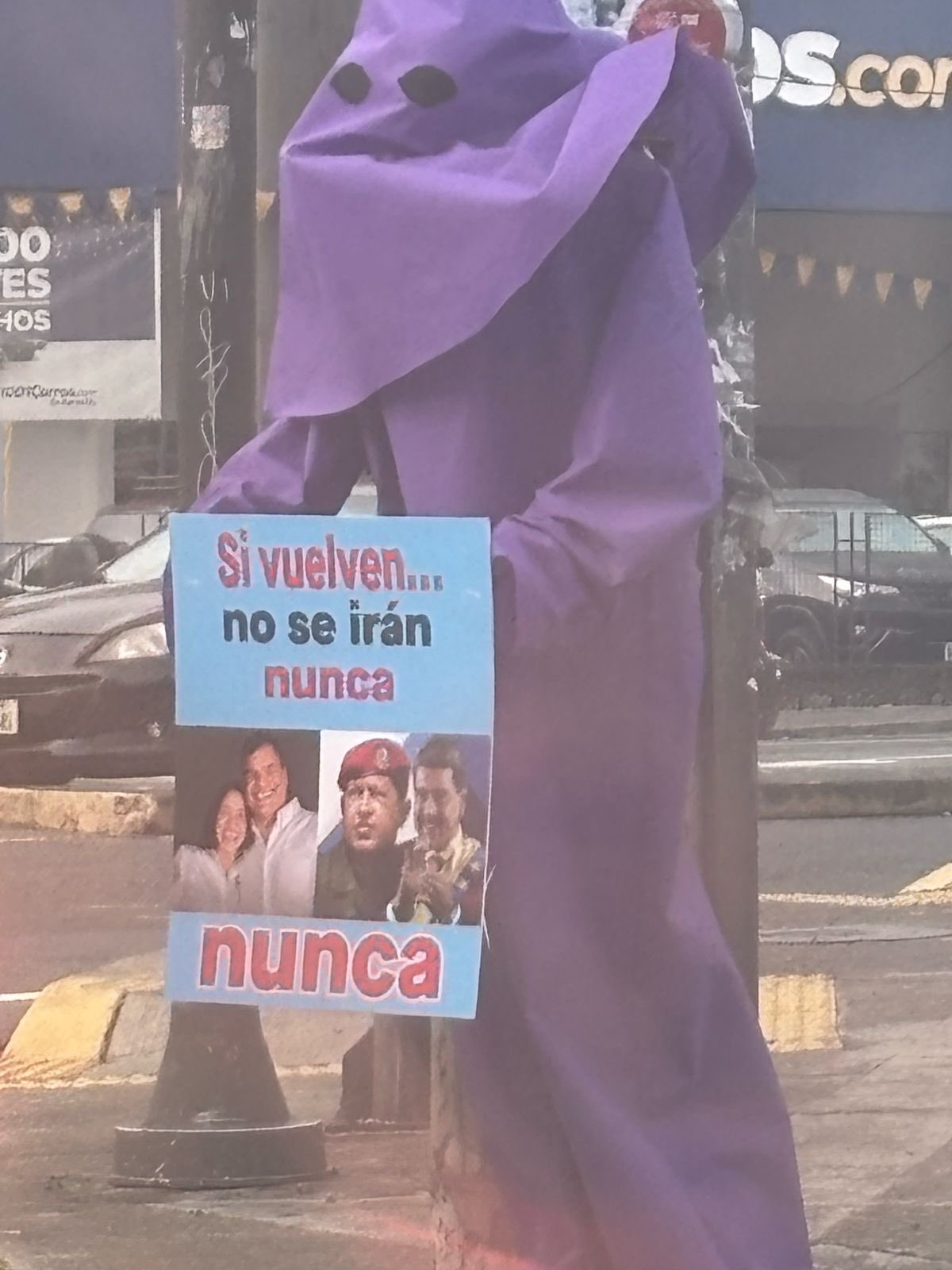 Este 10 de abril de 2025, en pleno sector de La Alameda, amanecieron colgados misteriosos trajes morado intenso que simulan los atuendos de los tradicionales cucuruchos. Pero esta vez, no se trataba de una manifestación de fe, sino de una potente protesta política: en las mangas de estas figuras colgaban las fotos de los líderes del llamado Socialismo del Siglo XXI.