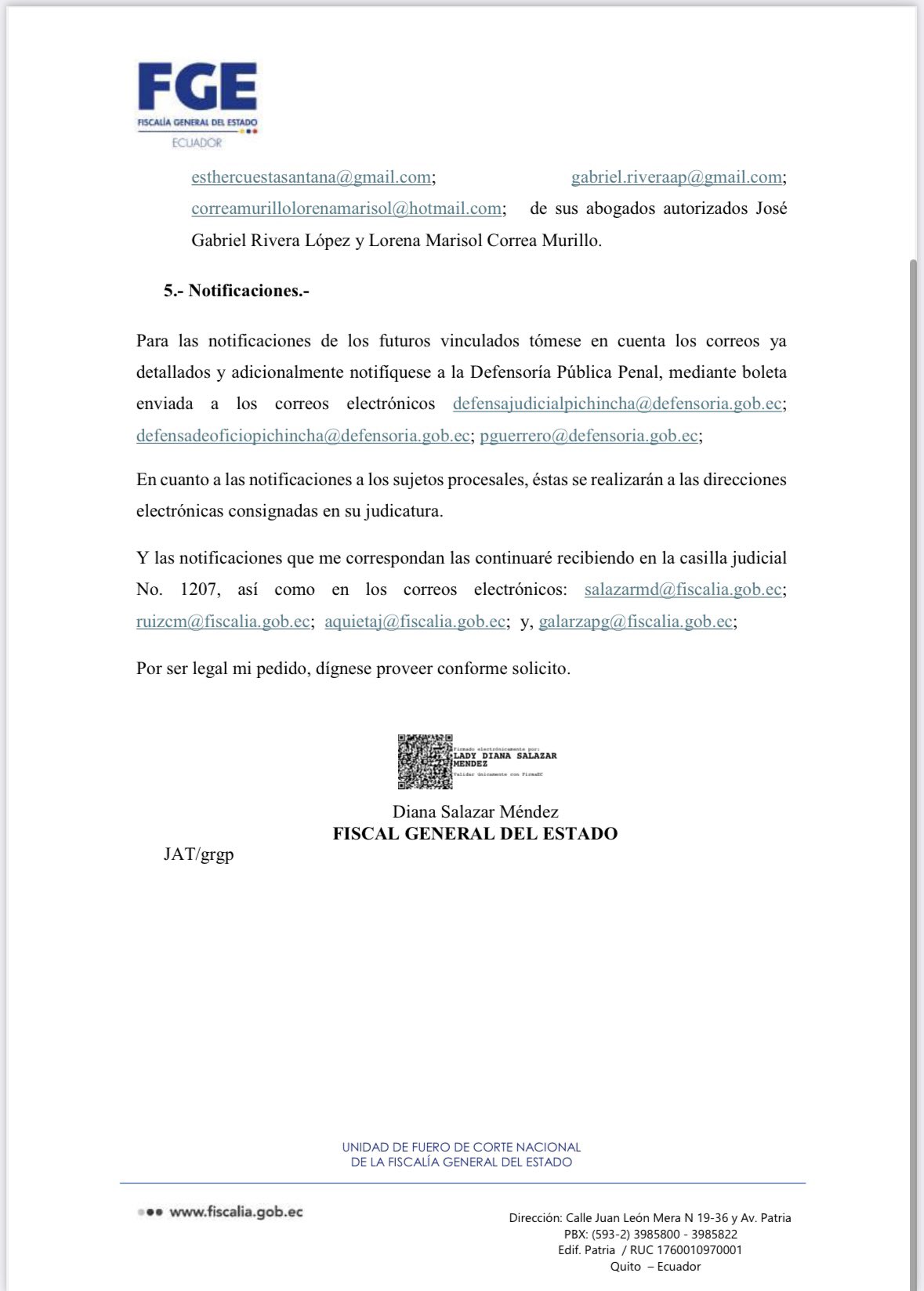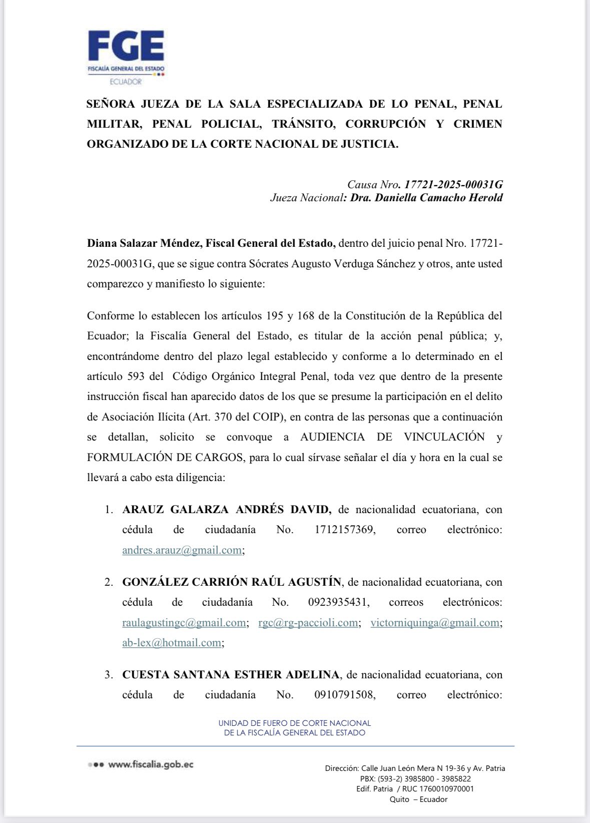 La fiscal Diana Salazar solicitó a la jueza Daniella Camacho que fije fecha y hora para la formulación de cargos contra Andrés Arauz, Raúl González Carrión y Esther Cuesta, quienes serán vinculados por el presunto delito de asociación ilícita dentro del caso Ligados.
