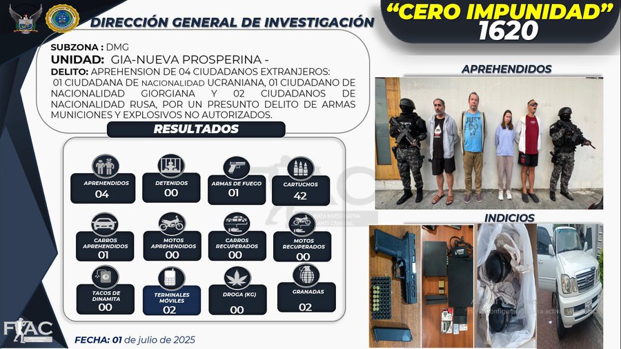 Durante un operativo de inteligencia ejecutado por la Policía Nacional en el sector de Nueva Prosperina, al noroeste de la ciudad, fueron aprehendidos cuatro extranjeros: dos ciudadanos rusos, un georgiano y un ucraniano. La intervención se dio tras un allanamiento a un domicilio, como parte de una investigación por tenencia ilegal de armas, municiones y explosivos.