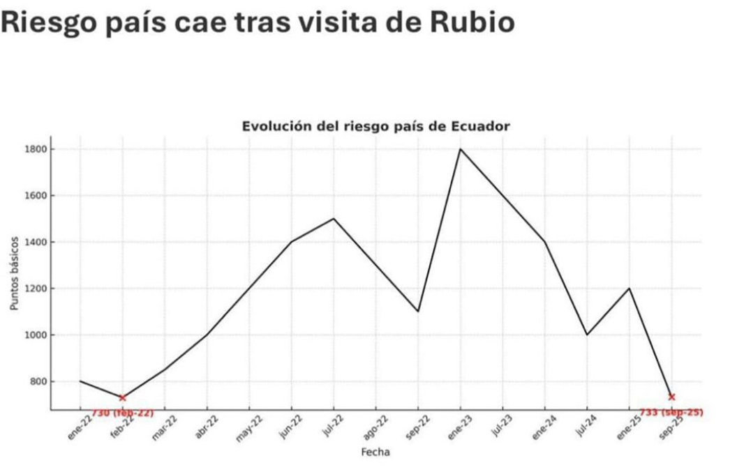 El riesgo país cayó a 733 puntos este 4 de septiembre de 2025, el nivel más bajo desde febrero de 2022, impulsado por la visita de Marco Rubio y el respaldo de Washington a Daniel Noboa.