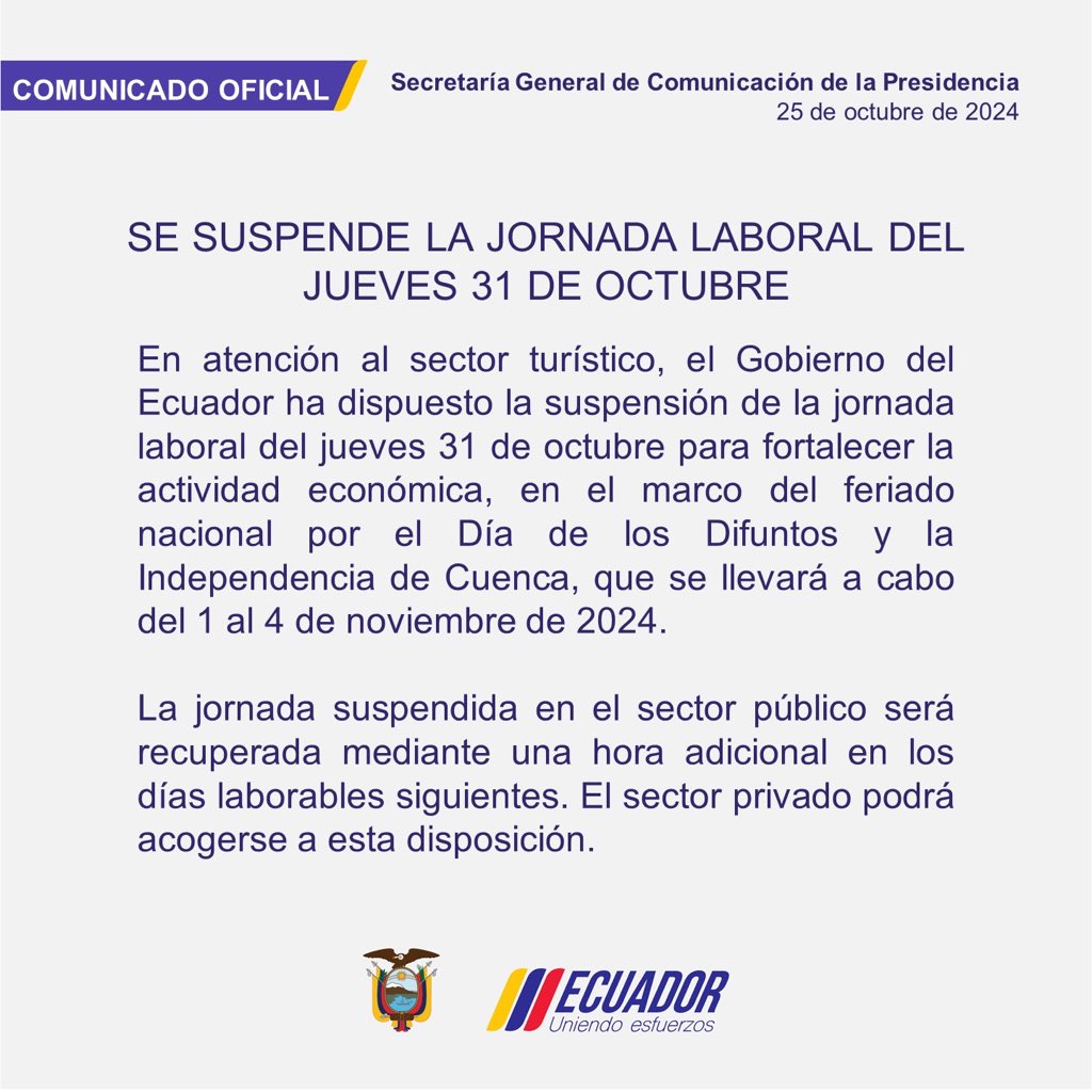 El Gobierno anunció la suspensión de la jornada laboral del jueves 31 de octubre con el objetivo de «fortalecer la actividad económica», en el contexto del feriado nacional por el Día de los Difuntos y la Independencia de Cuenca, que se celebrará del 1 al 4 de noviembre de 2024.