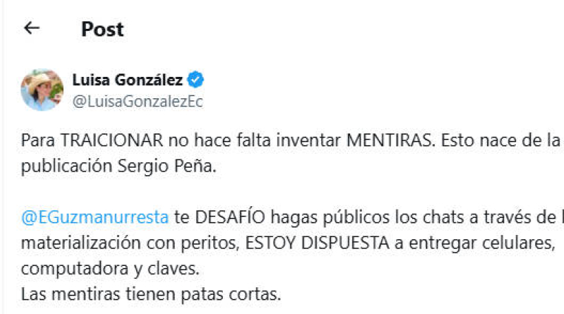Desde su cuenta oficial en X, Luisa González respondió a las acusaciones de Jhajaira Urresta con un mensaje desafiante: la instó a hacer públicos los supuestos chats mediante peritajes formales y aseguró estar dispuesta a entregar sus dispositivos y claves para esclarecer los hechos.