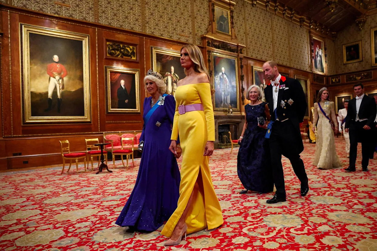 Por su parte, Melania Trump optó por un vestido amarillo con los hombros descubiertos, combinado con un cinturón rosa pastel. Aunque cumplió con el protocolo, muchos críticos de moda lo calificaron como un “arriesgado desacierto” frente al impecable despliegue de la realeza británica. La comparación no tardó en viralizarse en redes sociales, donde varios usuarios hablaron de una “derrota estilística” para la exprimera dama.