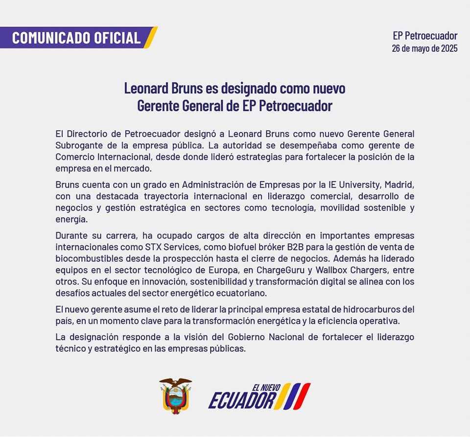 El directorio de Petroecuador designó este lunes 26 de mayo a Leonard Bruns como nuevo gerente general subrogante de la empresa estatal petrolera.