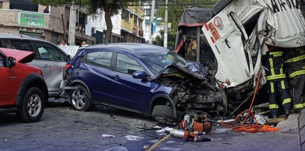 Un camión con aparente falla en los frenos provocó un violento choque múltiple la mañana de este martes en la intersección de las calles Bernardo de Legarda y Buenaventura Aguilera, al norte de Quito.