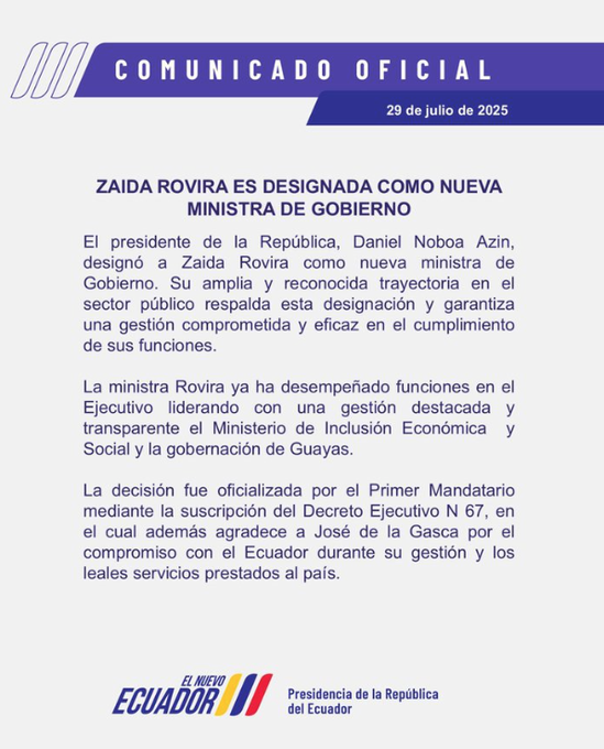 Zaida Rovira Jurado fue oficialmente designada como la nueva ministra de Gobierno de Ecuador este 29 de julio de 2025, en reemplazo de José De la Gasca, según anunció la Presidencia mediante el Decreto Ejecutivo N.º 67.