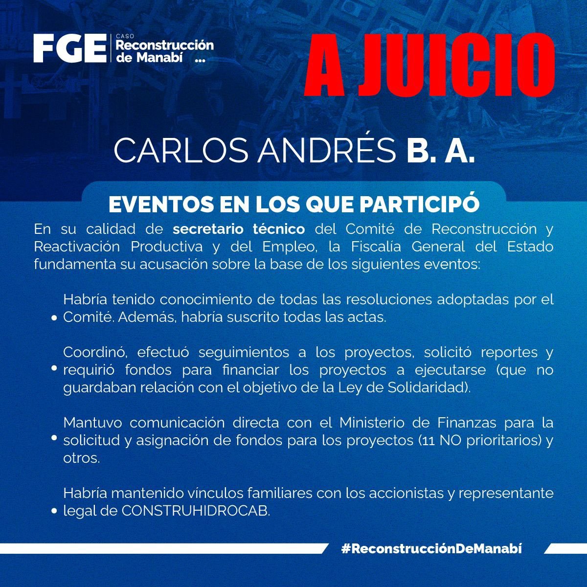 En cuanto a Carlos Bernal, la Fiscalía lo señala por haber tenido conocimiento de todas las resoluciones del Comité, firmar sus actas, dar seguimiento a proyectos ajenos a la Ley de Solidaridad, gestionar fondos millonarios y mantener lazos familiares con representantes de la empresa Construhidrocab, una de las beneficiadas.