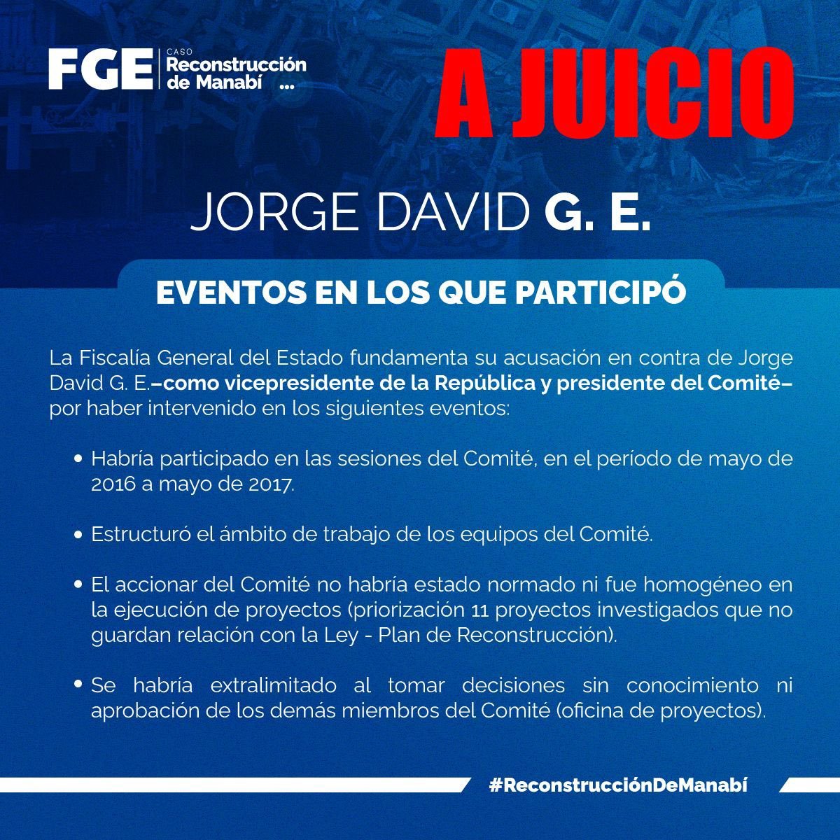 La Fiscalía General del Estado sustenta su acusación en la presunta participación activa de Glas entre mayo de 2016 y mayo de 2017 en el Comité de Reconstrucción, período en el que habría definido estructuras de trabajo, priorizado proyectos irregulares, y tomado decisiones sin consenso, contraviniendo el Plan de Reconstrucción.